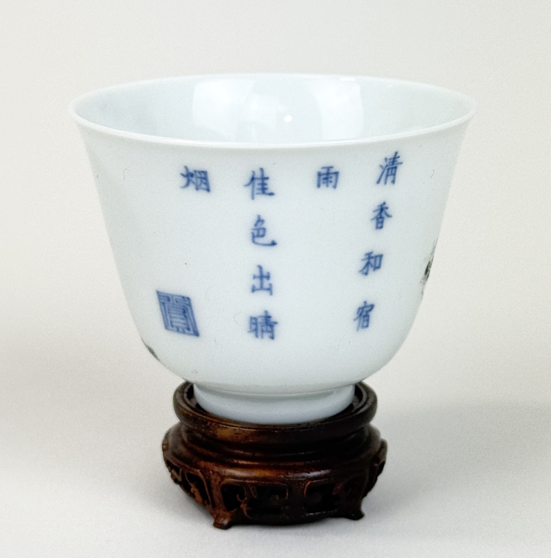 The Imperial wine cup, painted with flowering apricot and a poem that can be translated 'The Fragrance (of the flowers) mingles with the scent of evening rain. Their lovely colour is enhanced by the sunshine or mist'.